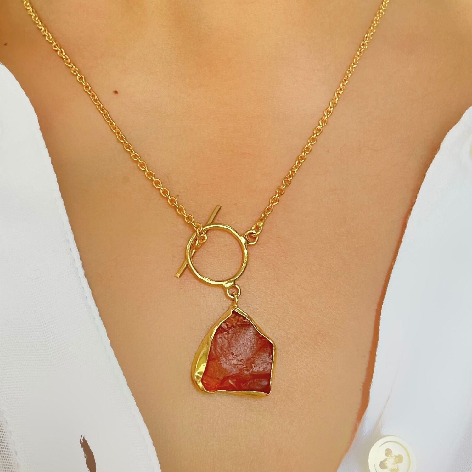 The "Infinite Love Opulent Natural Stone Pendant Necklace" is a luxurious and elegant piece featuring a Carnelian Natural Stone that exudes sophistication. It is gold plated, ensuring durability and radiance, with an anti-tarnish finish. The pendant's unique closure adds to its style, making it a standout piece for any occasion. Perfect for adding a touch of luxury to any outfit, this pendant is sure to become a treasured piece in your collection.